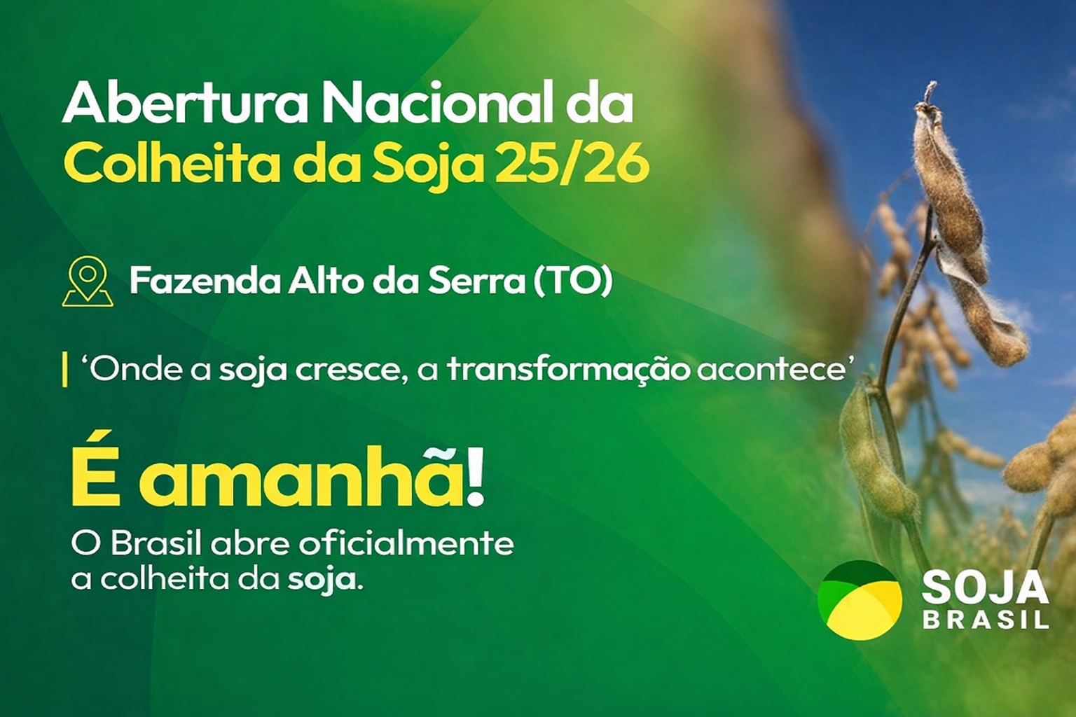 Amanhã, a partir das 9h, será realizada a Abertura Nacional da Colheita da Soja 2025/26, com transmissão ao vivo pelo YouTube, diretamente da Fazenda Alto da Serra, pertencente ao Grupo Wink, em Porto Nacional (TO).